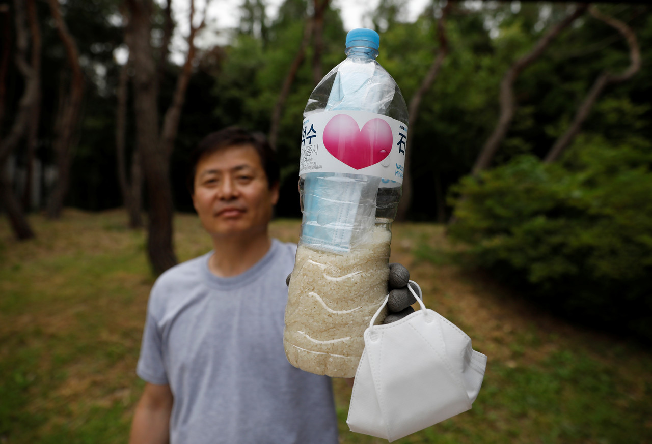 ▲▼脫北團體「巨泉」將白米倒進寶特瓶內。(圖/路透社)