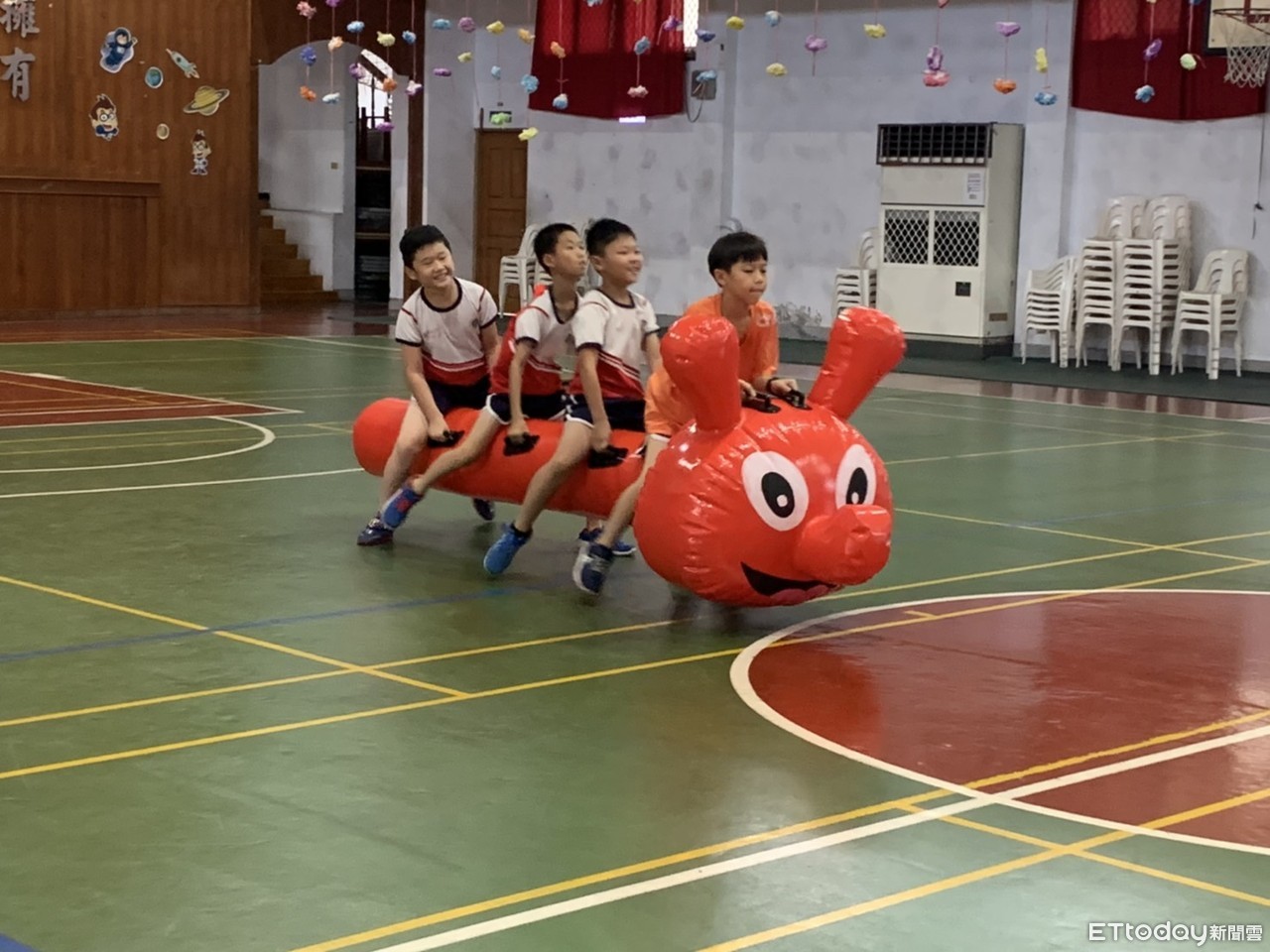 ▲鎮南國小讓孩子充氣龍舟艇來比賽陸上競走讓端午節氣氛更是趣味橫生。(圖/記者蔡佩旻攝)