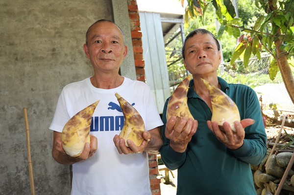 ▲邱焯勳(左)、游許義指出,「矮肥短,腰彎彎」的綠竹筍是上筍,最好吃。(圖/廖姓民眾提供)