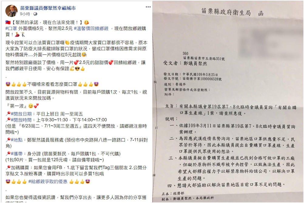 國民黨苗栗縣議員鄭聚然3月在議會質詢時,針對「口罩荒」開罵衛生局,並表示自己願投資600萬元買2台機器生產口罩,賣5個10元,讓民眾不用排隊就可以買到,還自豪「不然你叫我們苗栗國做什麼?」3個月過去,鄭聚然在臉抒發文「聚然的承諾,現在合法來兌現!」宣布開賣2.5元的口罩。