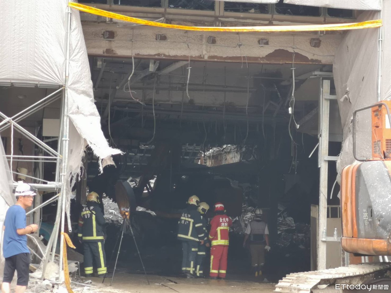 記者黃彥傑/台北報導台北市松山區20日發生一起事故,京華城內部拆除工程,工地內倒塌,疑似有工人受困。消防人員現在用工地內怪手開挖,至於事故詳細發生原因、人員傷亡等仍有待進一步調查釐清。▲工人受困。(圖/記者黃彥傑攝)