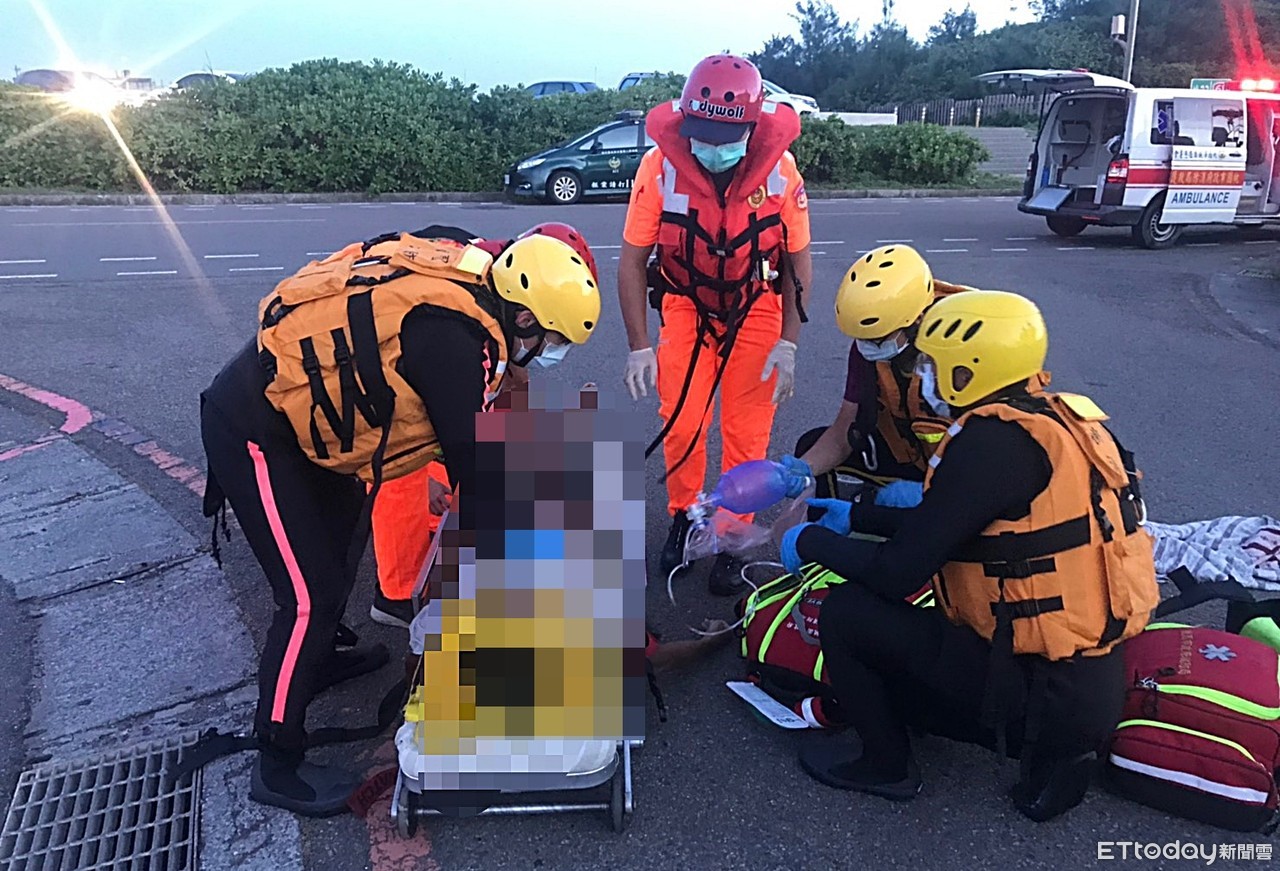 ▲桃園市大園區竹圍漁港20日傍晚發生男子失足溺水案,消防人員打撈上岸施做CPR並緊急送醫。(圖/記者沈繼昌翻攝)