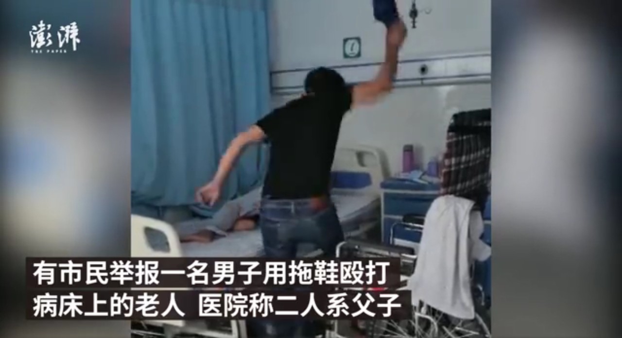 安徽省阜陽市一名黑衣男子18日在臨泉縣醫養院內,不滿生病父親尿失禁,又不配合翻身,拿著拖鞋不斷對其毆打,過程被拍下上傳網路。打人男子很快被警方行政拘留。