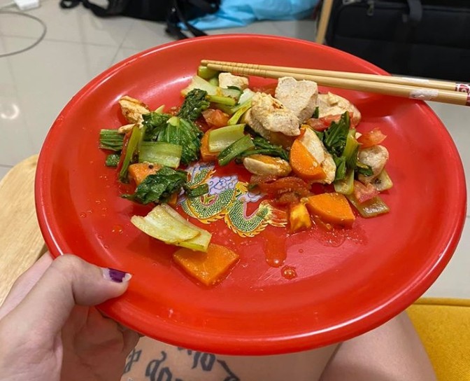 原PO在臉書社團《爆怨公社》貼出照片,美國朋友隨意炒了一些青菜、雞肉給她吃,但使用的容器卻是廟裡常見的「拜拜盤」,通常是用來放乾果、餅乾等祭品,所以她端著這盤吃東西內心百感交集,吃到一半盤子還漸漸顯露出飛龍圖案,讓她實在越吃越毛。