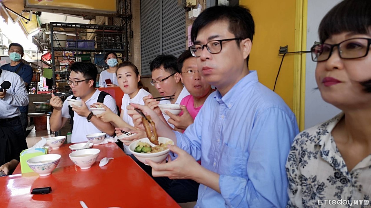 ▲陳其邁至內惟廟品嘗肉燥飯 。(圖/記者吳奕靖攝)