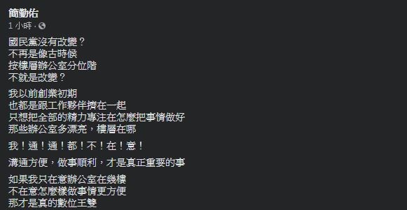 對此,簡勤佑表示,國民黨已經不再像古時候按樓層辦公室分位階,這不就是改變嗎?並舉例當初創業也都是跟工作夥伴擠在一起,只想把全部的精力專注在怎麼把事情做好,那些辦公室多漂亮,樓層在哪「我!通!通!都!不!在!意!」