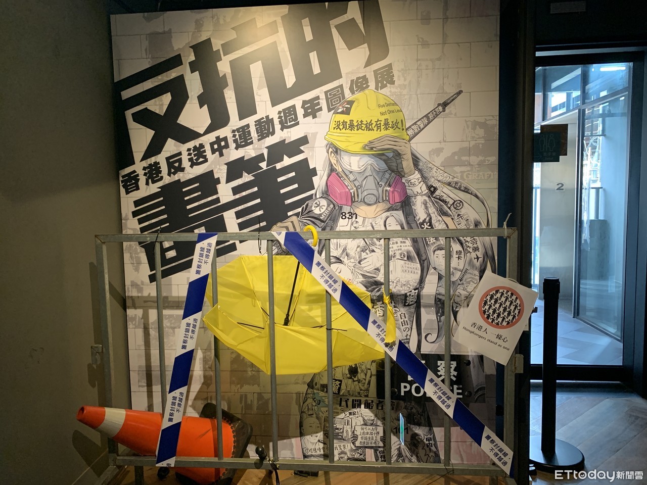 ▲▼現場以拒馬、海報、警示帶、便利貼、閃動的燈管、地鐵背景等,打造香港抗爭現場情境。(圖/記者林育綾攝)