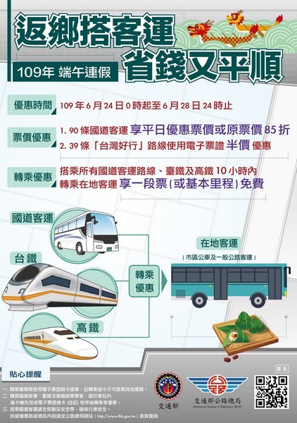桃園監理站指出,為方便端午連假期間觀光出遊或返鄉探親民眾,同時提供順暢的交通,除國道客運票價優惠外,在轉乘優惠部分,連假期間實施優惠舉凡搭乘國道客運及高鐵、臺鐵後轉乘在地客運均可享有優惠,提供民眾後續轉乘使用電子票證搭乘在地公路客運,可享有基本里程或市區客運一段票免費措施,歡迎您多加利用。