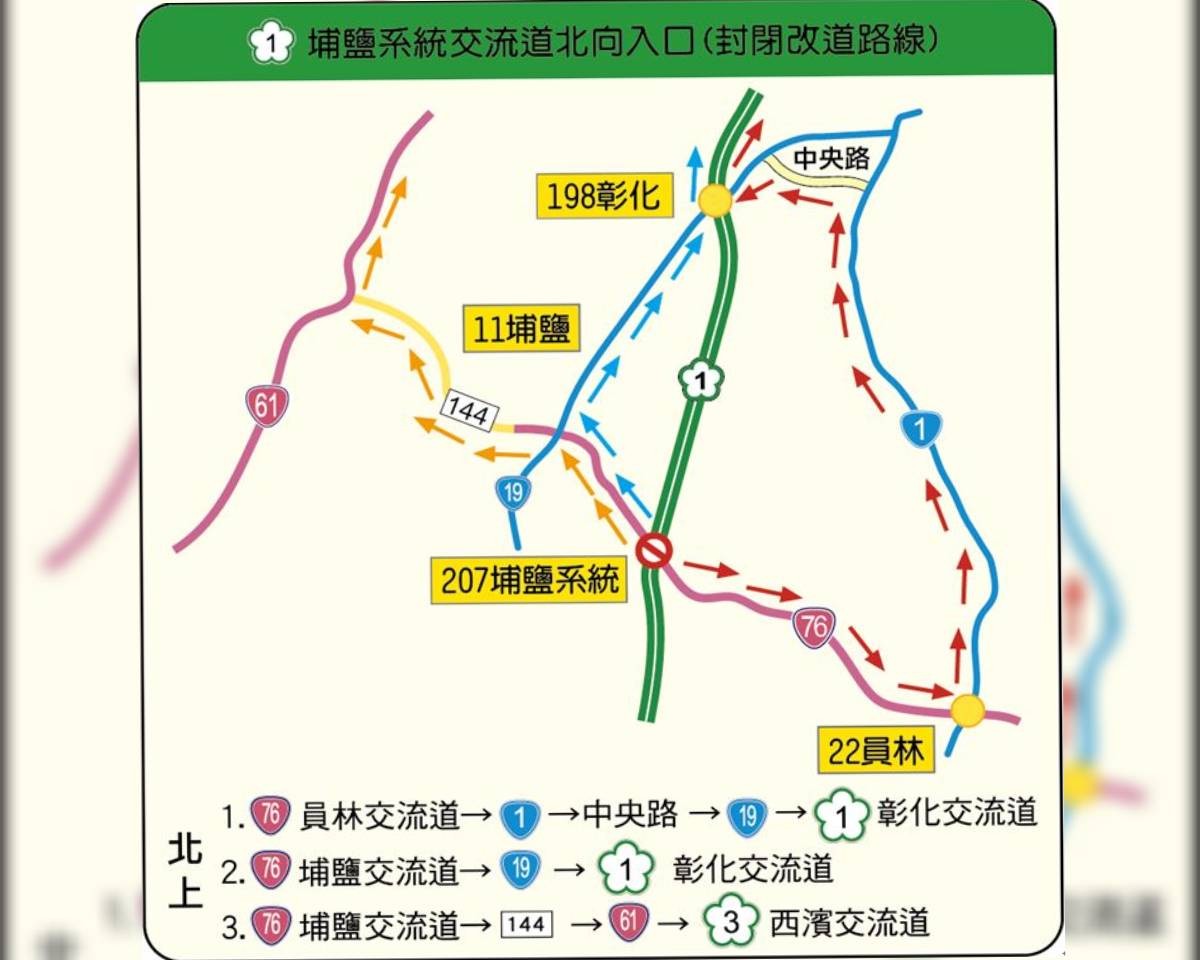 (二) 台76線欲轉國道1號北上,可由台76線埔鹽交流道→台19線(彰水路)→國道1號彰化交流道,或由台76線員林交流道→台1線→國道1號彰化交流道。