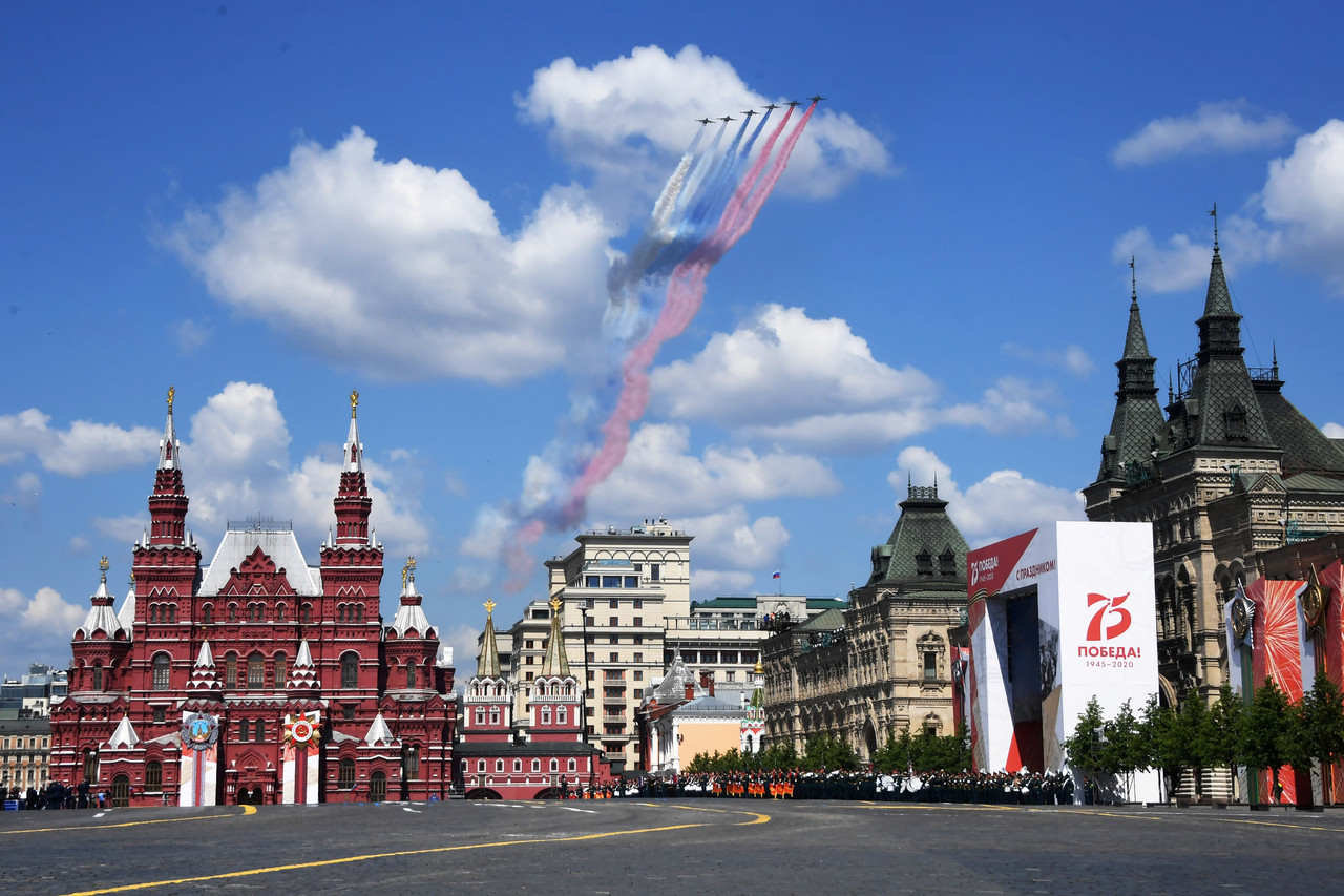 報導指出,75架軍機編成16個空中梯隊,由一架米-26直升機和4架米-8直升機的護衛下登場,最後由6架Su-25攻擊機噴出代表俄羅斯國旗白、藍、紅三色煙霧劃過典禮現場,為今年的紅場閱兵畫下句點。