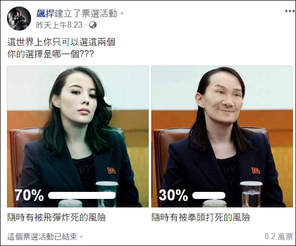 館長23日上午在臉書舉辦票選活動,開玩笑戲稱:「這世界上你只可以選這兩個,會選哪一個?」其一是修圖過的金與正,「隨時有被飛彈炸死的風險」,另外一個就是長髮版的自己,「隨時有被拳頭打死的風險」。吸引8.2萬網友投票,有70%都選擇了金與正,粉絲笑說「如果都會死的話,我寧願選金與正。」