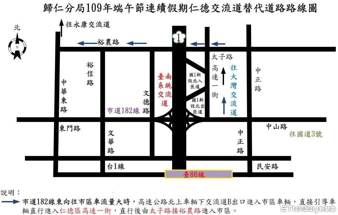 四、為有效疏導台86線快速公路往國道3號關廟交流道車流,於2020年端午節連續假期期間,歸仁分局每日8時至12時封閉台86線快速公路橋下迴轉道出入口,交通管制措施如下:(一) 市道182線東行至台86線橋下走迴轉道往國道3號關廟交流道車輛,直行歸仁區市道182線→台19甲線→國道3號關廟交流道。