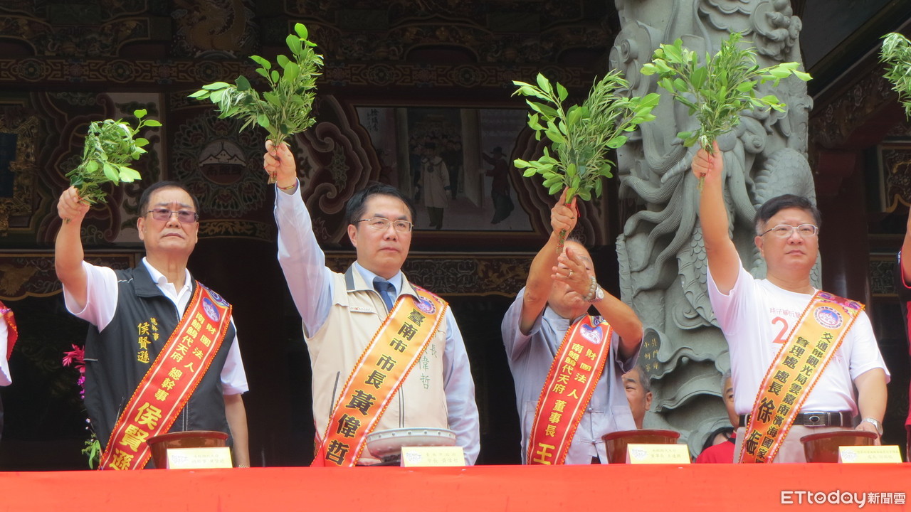 ▲台南市長黃偉哲等人參與在南鯤鯓代天府,首度端午取午時水防疫消災祈福法會。(圖/記者林悅翻攝,下同)