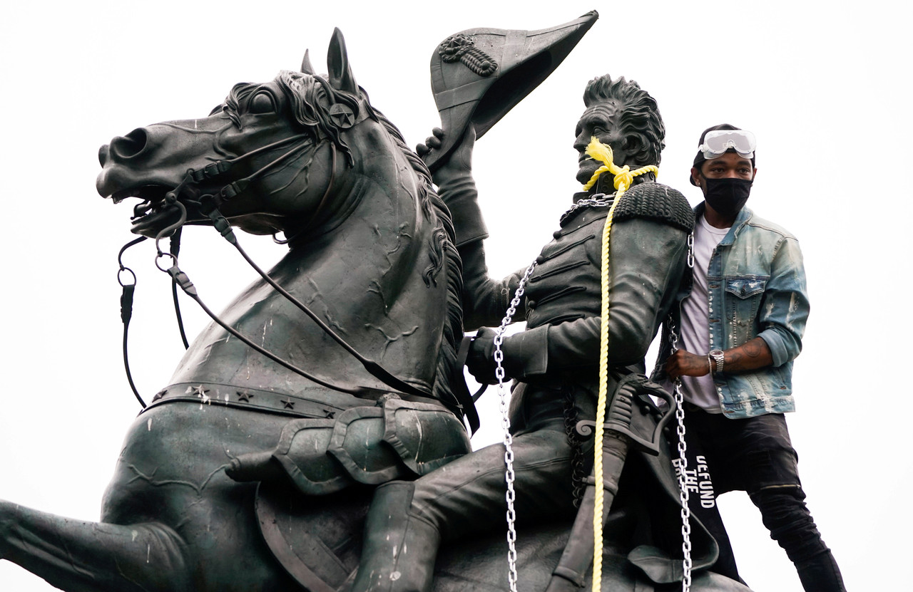 美國非裔男子佛洛伊德之死引發示威抗爭持續近1個月,華府與全美各地已有不少爭議人物雕像成為反種族主義示威者的目標。例如,23日晚間,有上百名示威者聚集在華府林肯公園(Lincoln Park)前,呼籲拆除解放黑奴紀念碑,因為該紀念碑描繪了高高在上的林肯俯視一名遭奴役黑人;22日則有示威者試圖拉倒白宮前的第7任美國總統傑克森雕像。