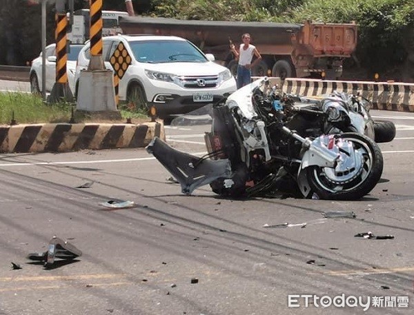 一輛新車價近130 萬元的本田重機GOLDWING,行經台3線龍潭段時,59歲鍾姓男騎士因闖紅燈遭自小客車擊落,車體零件散落路面,所幸騎士只有腳扭傷,連送醫都沒有,但這輛有「陸地航母」封號的本田旗艦重機幾乎全損,網友一看也紛紛表示:「撞成這樣,根本不用修了!」