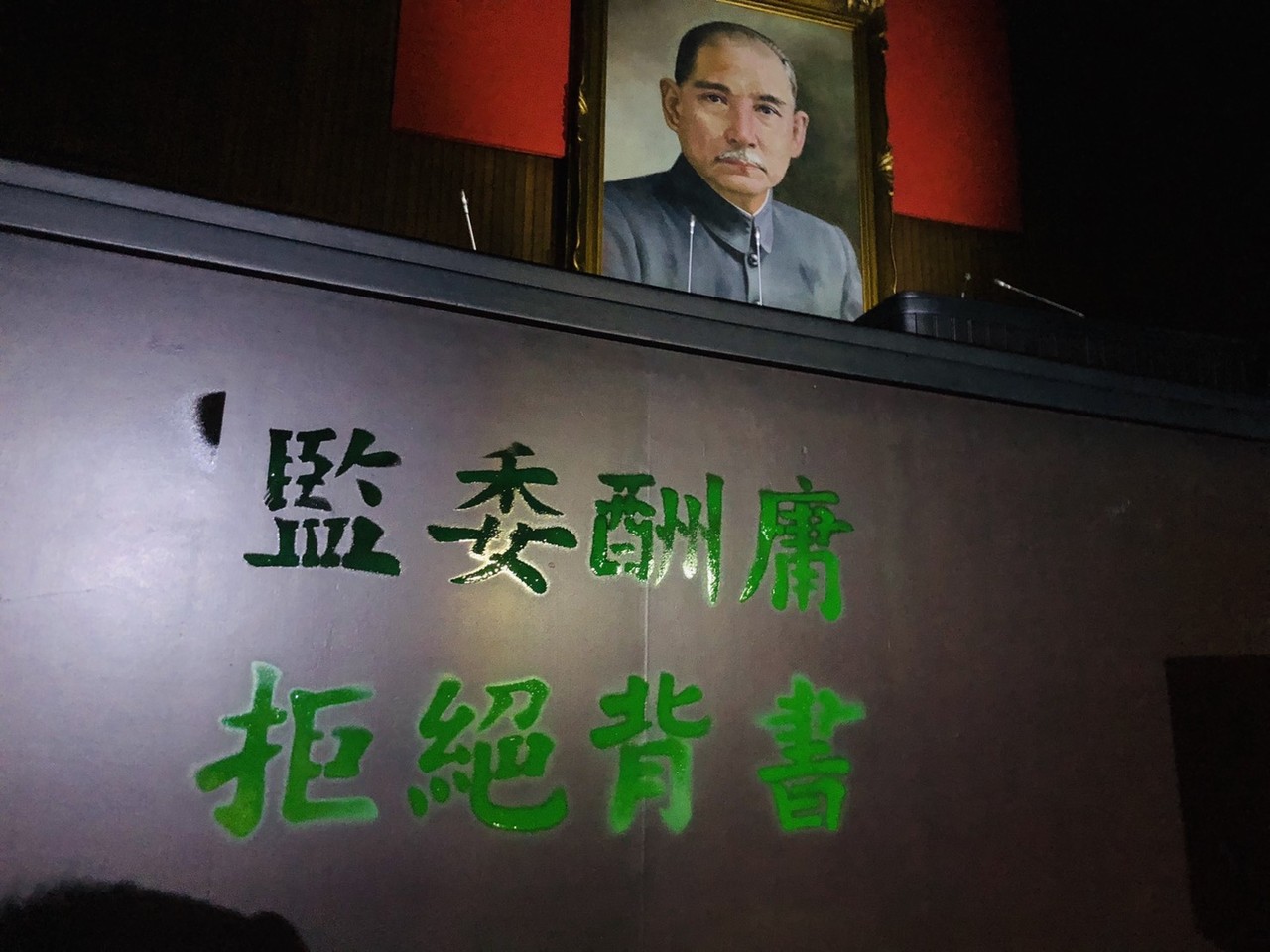 立法院加開臨時會時間未定,29日將再度協商臨時會議程。不過,國民黨團拒絕為監察委員人事背書,將近20位委員今天下午闖入立法院議場並佔據主席台,訴求監委拒絕背書,根據國民黨立委洪孟楷拍下的影片,立委已將議場內椅子堆疊在各入口處,並在主席台、發言台噴綠漆寫下「監委酬庸、拒絕背書」等大字樣。