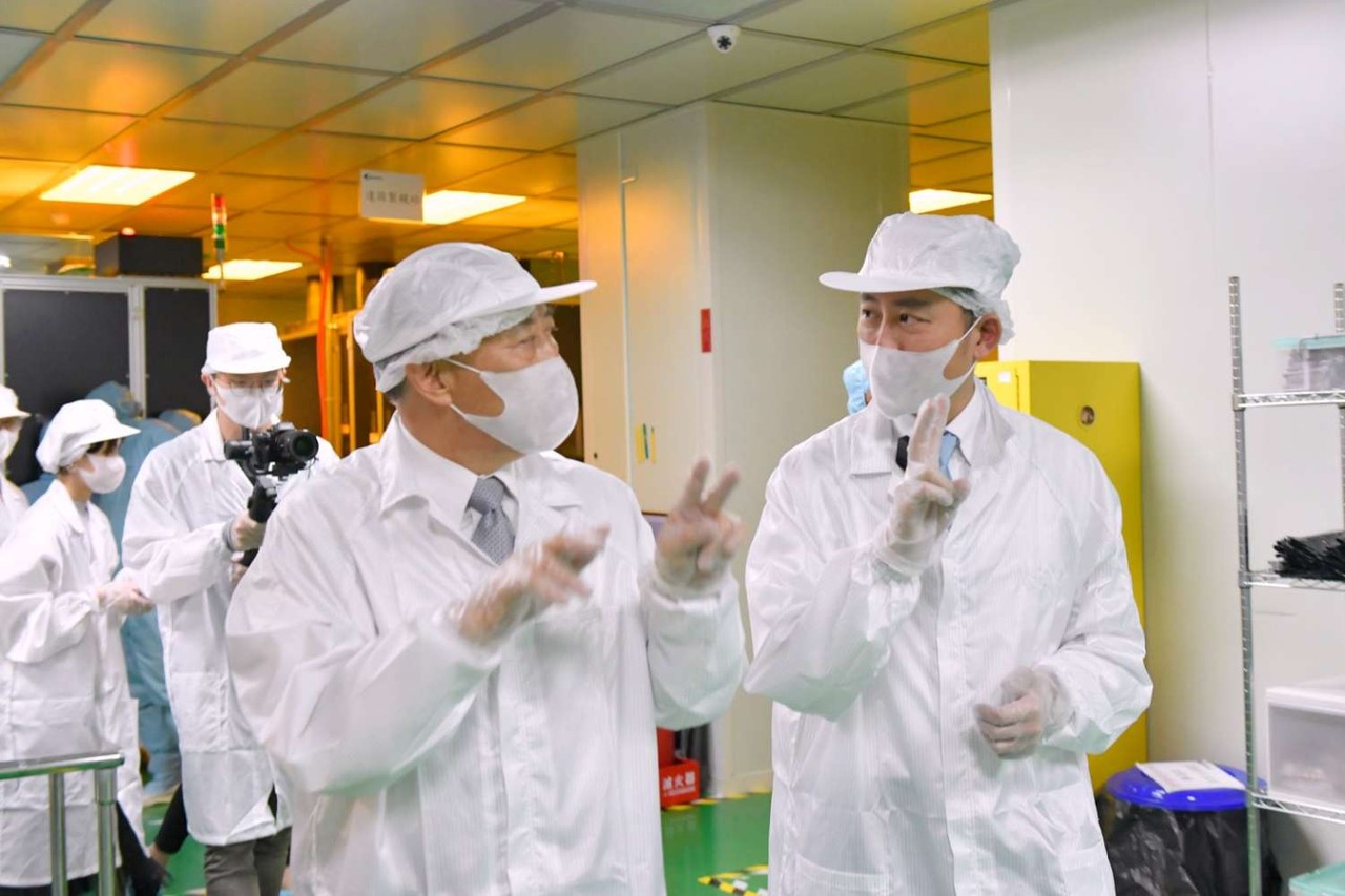 ▲新竹市長林智堅穿上無塵衣,前進隱形眼鏡製程廠區。(圖/新竹市政府提供)