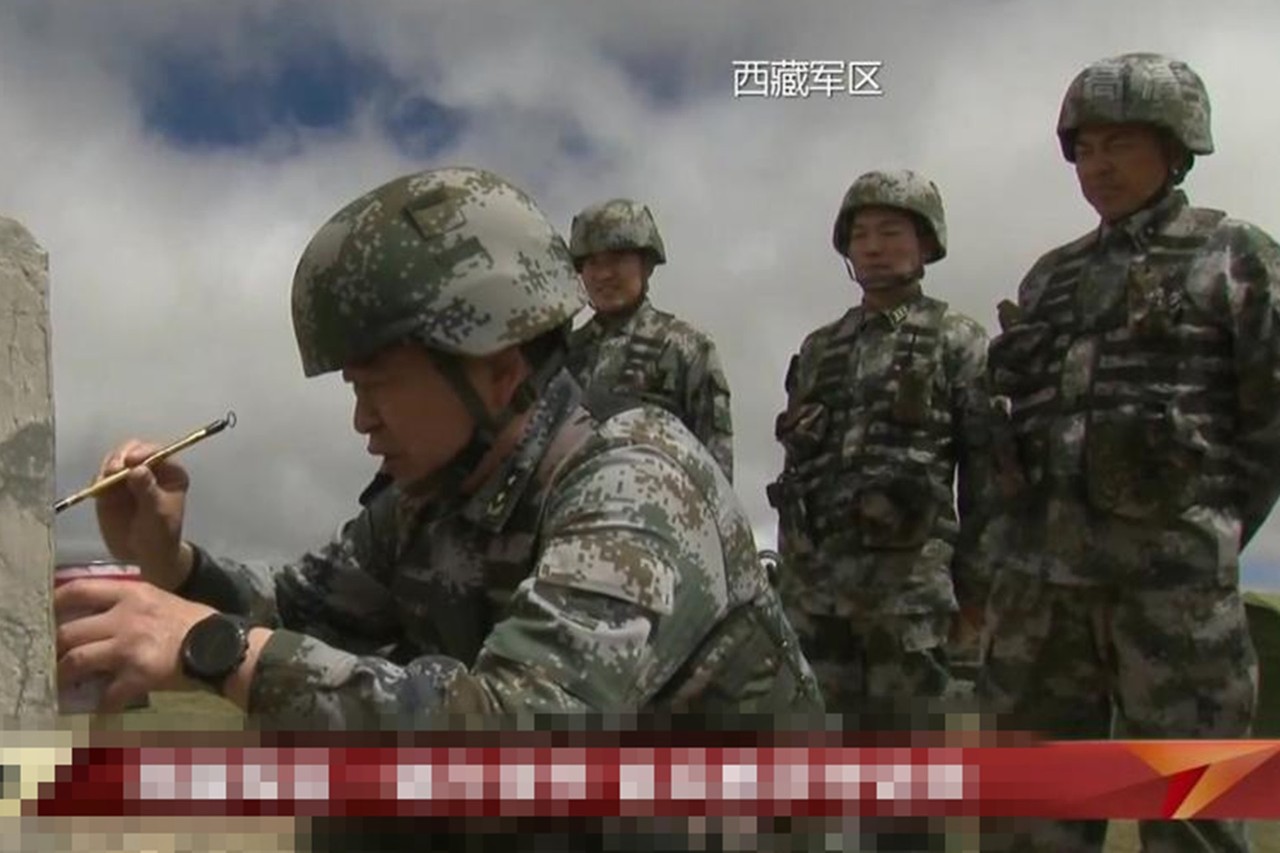中印邊境緊張局勢仍未緩解,據陸媒報導,解放軍西藏軍區中將汪海江在端午節期間與官兵一同巡邏邊境,在邊境親自以毛筆為界碑「描紅」,並於界碑前集合,展示五星紅旗宣示主權。