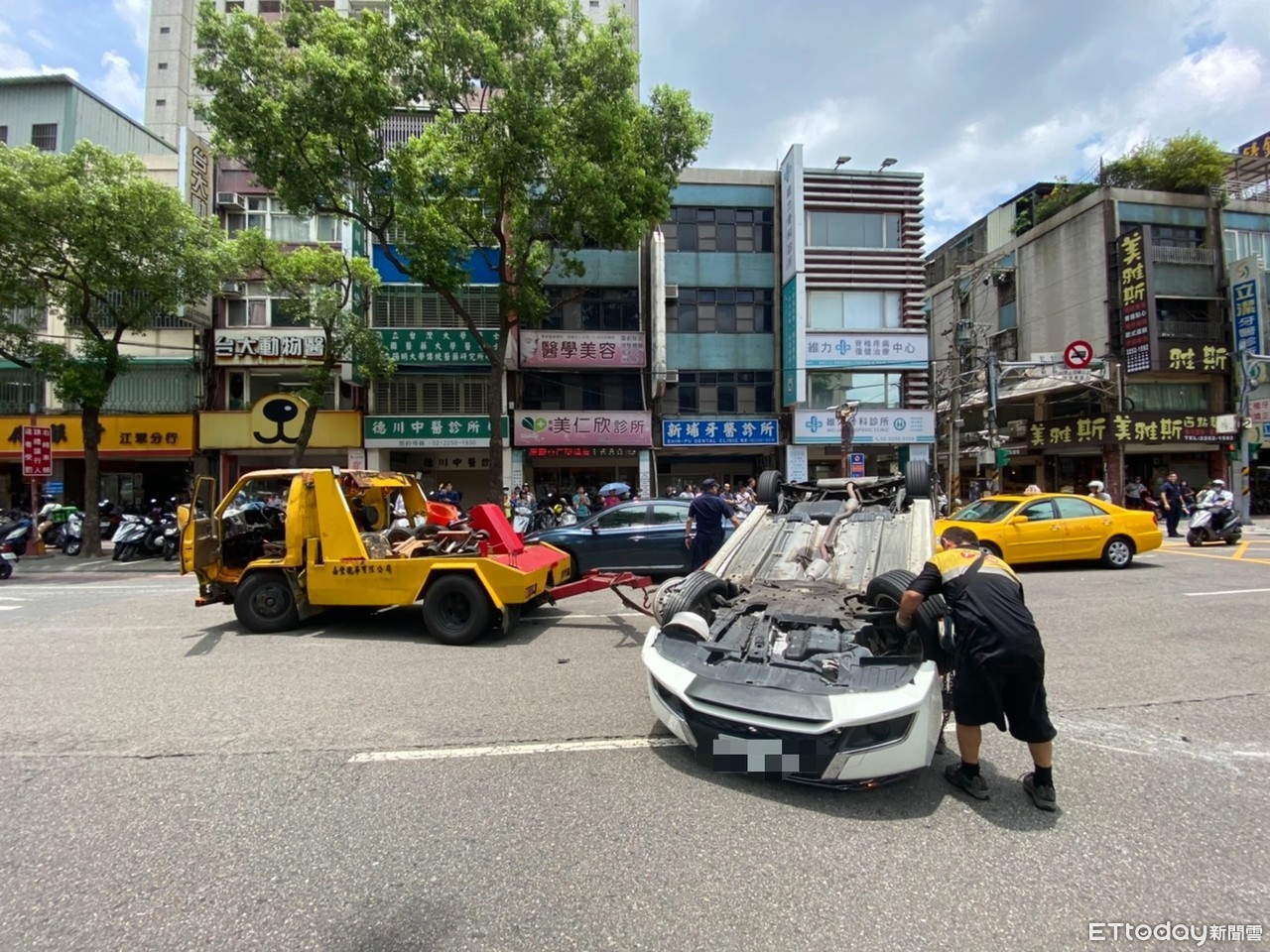 30日上午11時許,52歲黃姓男子開著白色小客車,載著友人,從文化路二段往板橋方向行駛,在行經光武街時,車子左前輪疑似爆胎,車子整個失控撞上中央安全島,隨後翻覆在地上滑行。