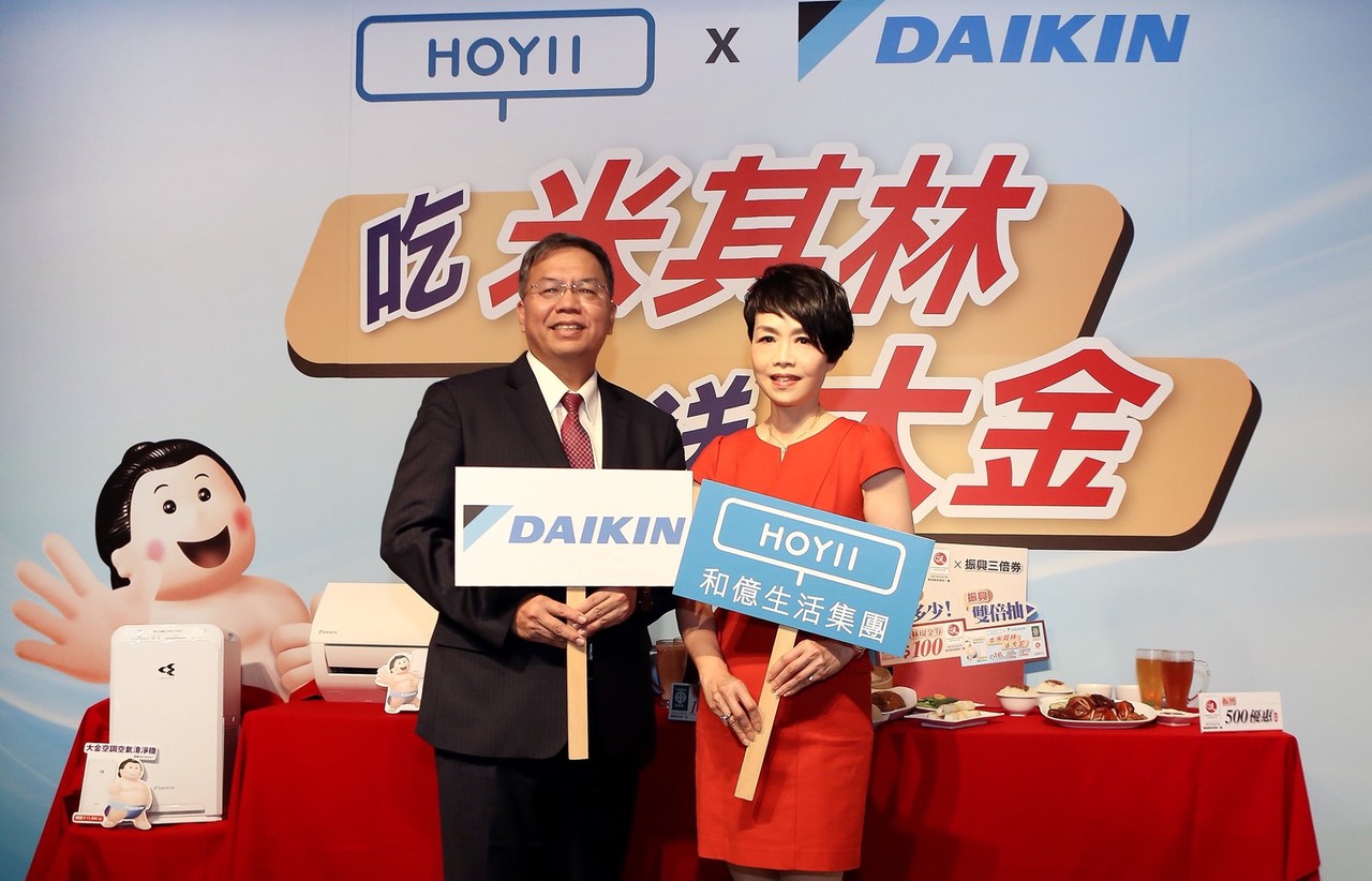 ▲吃米其林送大金記者會合照,左為和泰興業大金空調林鴻志執行副總,右為和億生活集團執行長蘇嬉螢。
