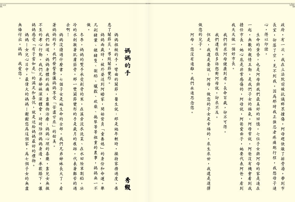 鄭文燦憶起15歲那年,他隻身北上就讀高中,大學時代受到時代氛圍的感動,選擇從台大電機系,轉學到社會系,放棄了平坦的人生道路,感謝阿母在第一時間,無法了解什麼是社會學時,就包容他充滿風險的決定;30歲返鄉參選桃園縣議員,以第一高票當選自此踏上政治這條路,而他擔任公職後,阿母並沒沒有改變原來的生活,對鄉親友善親切,人情義理,是非對錯,阿母都有一把尺…