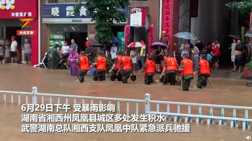 《央視軍事》在微博上PO出多段影片,可以看見湖南省湘西鳳凰6月29日多處傳積水情形,醫院裡的水位甚至淹過了膝蓋,武警湖南總隊湘西支隊鳳凰中隊11名官兵到場搬運院內醫療物資,並轉移當地20多名被困群眾與車輛,成了人民的英雄。