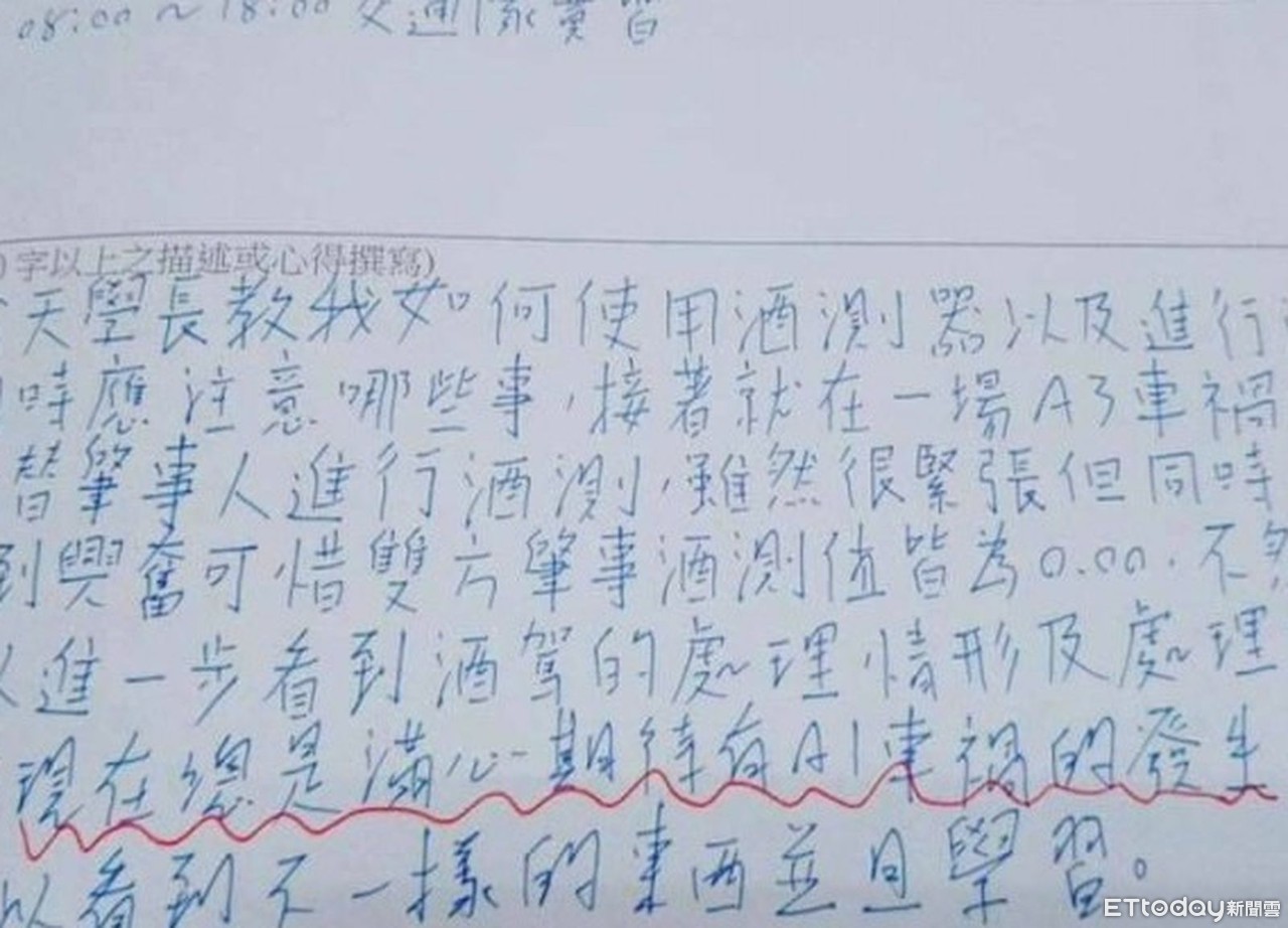 警界群組流傳一則菜鳥警實生,到某縣市交通隊實習心得工作日誌截圖。這位剛初入職場警察實習生,跟著學長處理A3車禍無人傷亡時,看到在旁學長指揮若定,忙碌量測、排除交通路障時,請警察實習生替肇事雙方進行酒測時。警實習生感到很緊張、興奮,可惜酒測值為零,不然就可以看到,如何處理酒駕流程。