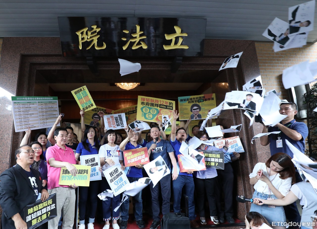 國民黨團也將高雄市長候選人陳其邁擔任立委期間主張廢考監,稱監委為「姦痿」的照片與黨籍委員一起將照片拋向天空,抗議民進黨政府不當提名「說一套做一套」,創黨黨綱訴求廢考監,現在全面執政卻將監委變成酬庸政黨人士的禁臠。