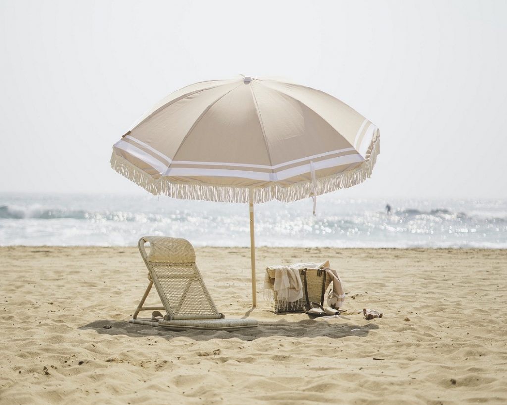 夏日海灘勢必擁擠,若想幫自己闢築時髦小天地,安靜吹著海風、瞻眺遠浪並打個小盹,那麼插上一把遮陽傘,絕對是防曬與休憩不可缺的沙灘單品。澳洲沙灘品牌Land and Sand Essentials這款沙灘傘,藍白經典條紋帶有海軍風,不僅清爽高雅,傘面還是用再生塑料瓶製成。永續意識之餘,機能設計也很精巧,不僅質量輕,摺疊傘柄設計讓傘身可高可低且便於收納,桿柄底座也能輕易插入沙底。