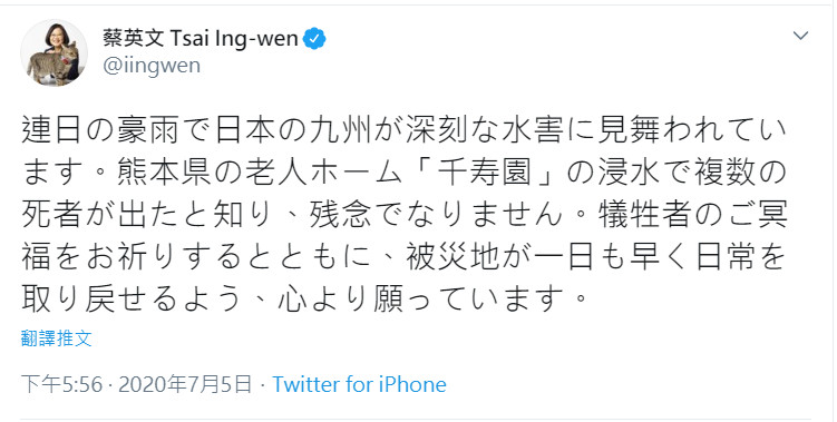 總統蔡英文5日下午先是以日文寫道,「連日的暴雨造成日本九州地區嚴重的洪災,我得知熊本縣的老人安養中心『千壽園』因為淹水造成多人死亡,對此我深感遺憾。在此我向逝者祈福,並衷心期盼災情能早日恢復原狀。」