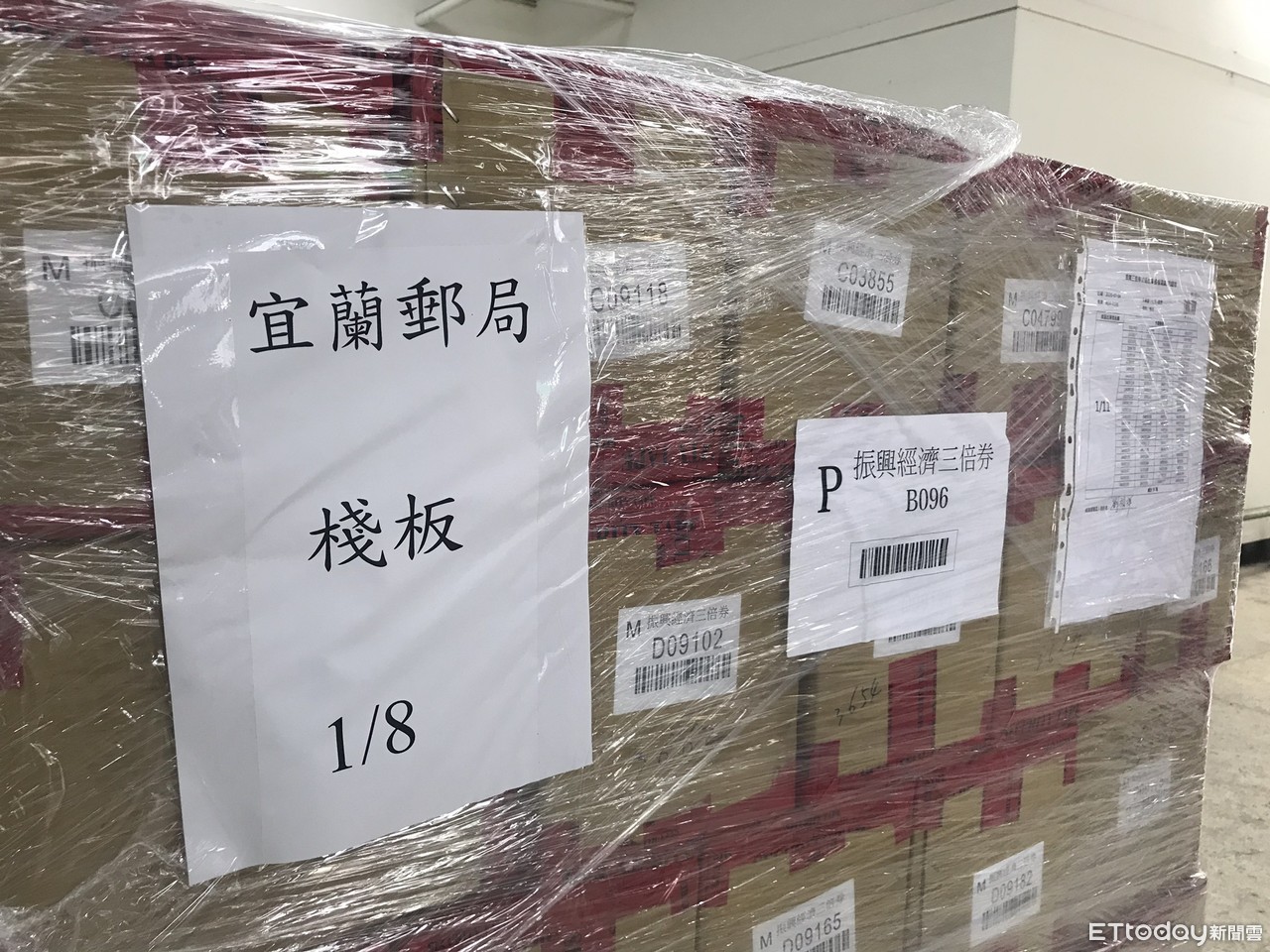 在警方重重備護下,5億1千780萬元836箱實體三倍券,從台北郵局總局6日近中午時許首站運扺宜蘭,發7日起將陸續配發到各郵局,宜蘭郵局表示,預計15日讓民眾在各郵局購買。