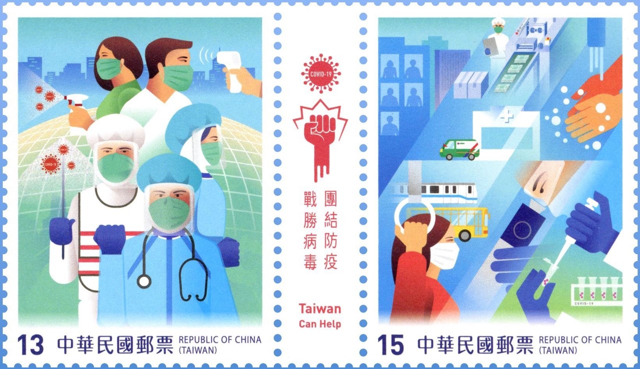 ▲中華郵政將發行防疫郵票,兩枚郵票間另加印「團結防疫,戰勝病毒」及「Taiwan Can Help」之過橋文字。(圖/中華郵政提供)
