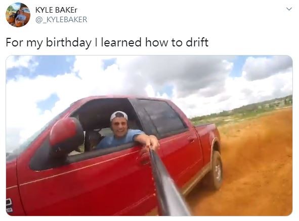 許多人都覺得開車甩尾超帥,不過在技術還沒純熟,車子也並非賽車的情況下做,可是一件十分危險的事情。推特帳號「KYLE BAKEr」先前PO出一篇貼文寫道「我在生日時學會如何甩尾」,隨後附上一個影片,畫面中可以看到一輛紅色的車子裡面,坐著3名約莫10幾歲的青少年,其中坐在駕駛位置上的少年不僅沒綁安全帶,一手握著方向盤,另一手還拿著自拍棒,以危險的姿勢和行動記錄他們的作為。