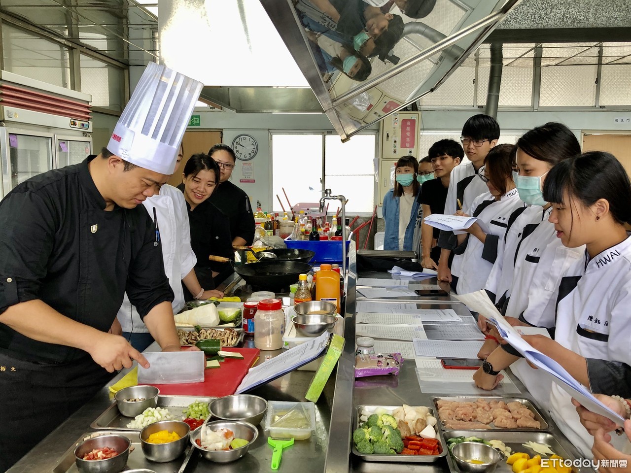 ▲中華醫大黃裕文老師(左前一)帶領學生從菜單設計、選材到烹飪上桌一氣呵成,師生開心展現完成的國宴佳餚。(圖/記者林悅翻攝,下同)