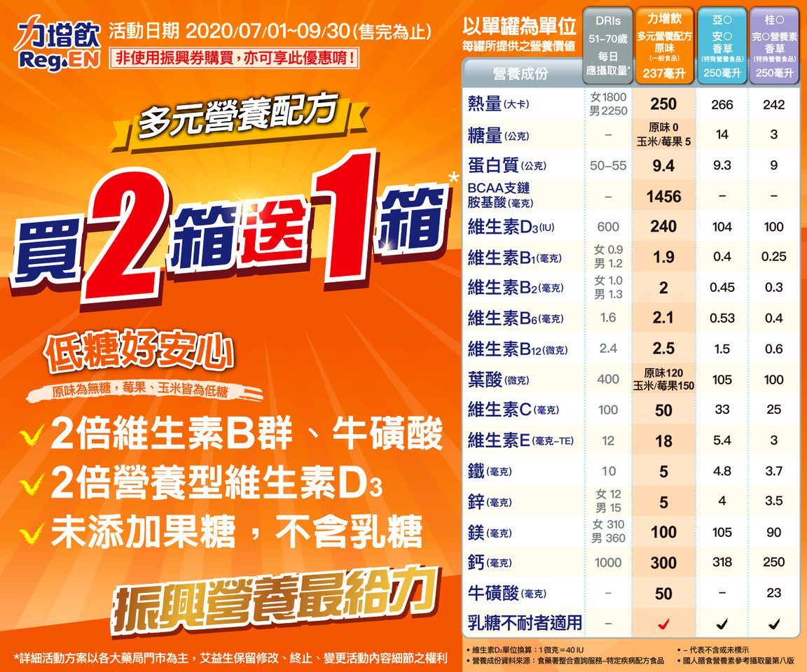 為了讓所有國人都能享用優質的營養品,力增飲宣布推出震撼營養品市場的「最佛系」、「最振興」促銷方案,即日起到各大藥局通路購買力增飲多元營養配方,可享有「買2箱送1箱」的優惠,平均每罐不到$40。活動從7月1日起到9月30日,可到各大藥局門市購買,售完為止。
