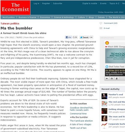 這篇題為「Ma the bumbler」(笨蛋馬英九)的報導,在2012年11月16日刊出,馬上掀起討論,網友紛紛在《批踢踢實業坊》、各大論壇等討論自己總統被罵笨這事,該篇文章當時超過萬人按讚,甚至有網友說,「完了,總統的笨獲得國際認證了。」