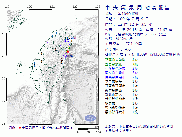 不到1小時又一震!根據氣象局地震報告,今(9)日12時12分,花蓮縣近海發生規模4.6地震,地震深度為深27km。各地最大震度,花蓮3級、宜蘭3級、南投2級、苗栗2級、台中1級、新竹1級、新北1級、桃園1級、彰化1級、雲林1級。