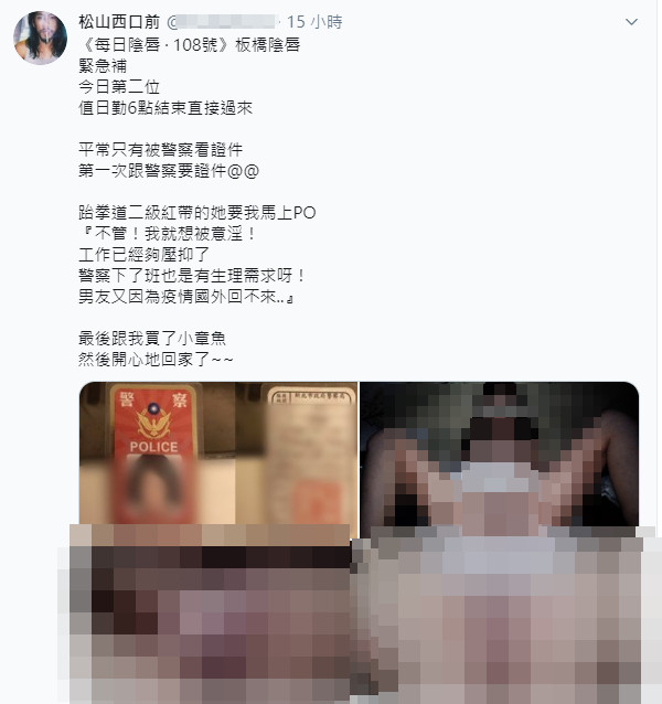 2017年拍攝7女戰6男雜交淫趴的情色攝影師「穆川申」,8日晚間在個人Twitter上分享了一篇情趣用品販售文,文中貼出一名女警的警員服務證,以及下體特寫照片,稱該女警說「不管!我就想被意淫!工作已經夠壓抑了,警察下了班也是有生理需求呀!」由於地點標明在新北板橋,記者向板橋區警方求證後,初步清查無該女警資料,且該服務證已是3年前的款式,將追究其相關刑責。