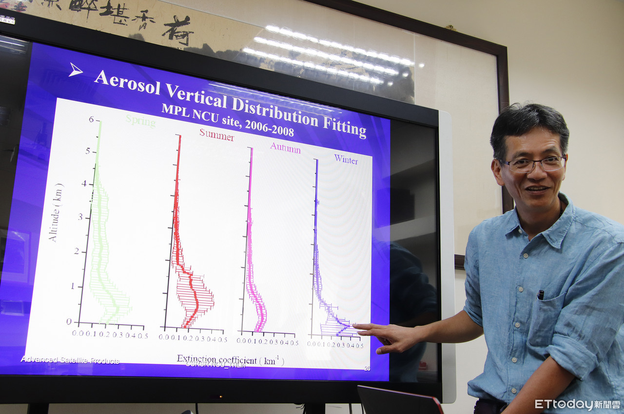 ▲林唐煌說明大氣氣膠垂直分布擬合,以及主要成分辨識,掌握這兩個最重要的關鍵參數,數位預報平台便指日可待。(圖/中央大學提供)