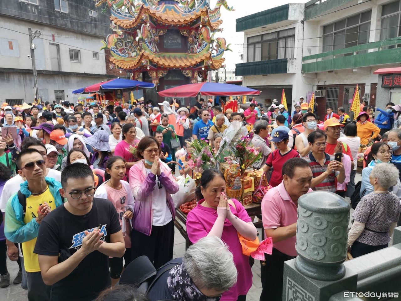 ▲信眾雙手合十跪在廟前廣場虔心祈福。(圖/記者唐詠絮攝,以下同)