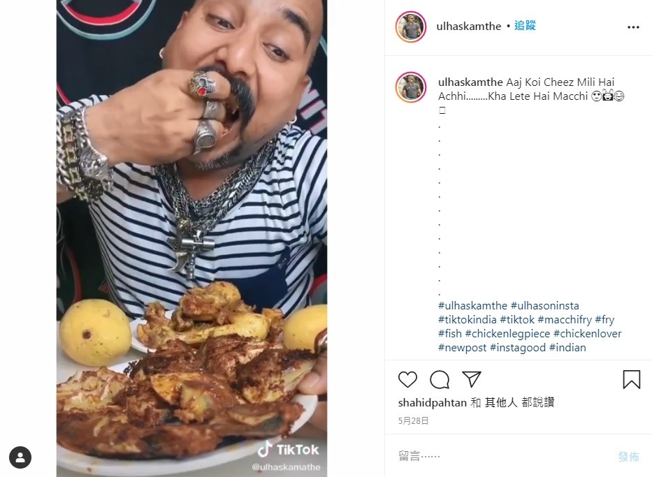 「華盛頓郵報」報導,41歲的卡馬特(Ulhas Kamathe)在孟買開健身中心,自從他開始在TikTok表演啃雞腿分享美食後,生活就開始大不同,每天會有數百萬人看他大嚼心愛的食物並用他專有風格描述滋味。