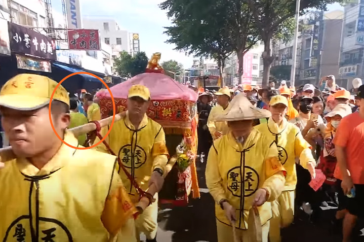 媽祖鑾轎「停車」約20秒後,開始搖擺,接著快速左彎繞路,「甩尾」通過他們,身後的男女則馬上抬頭起身,往路旁移動。