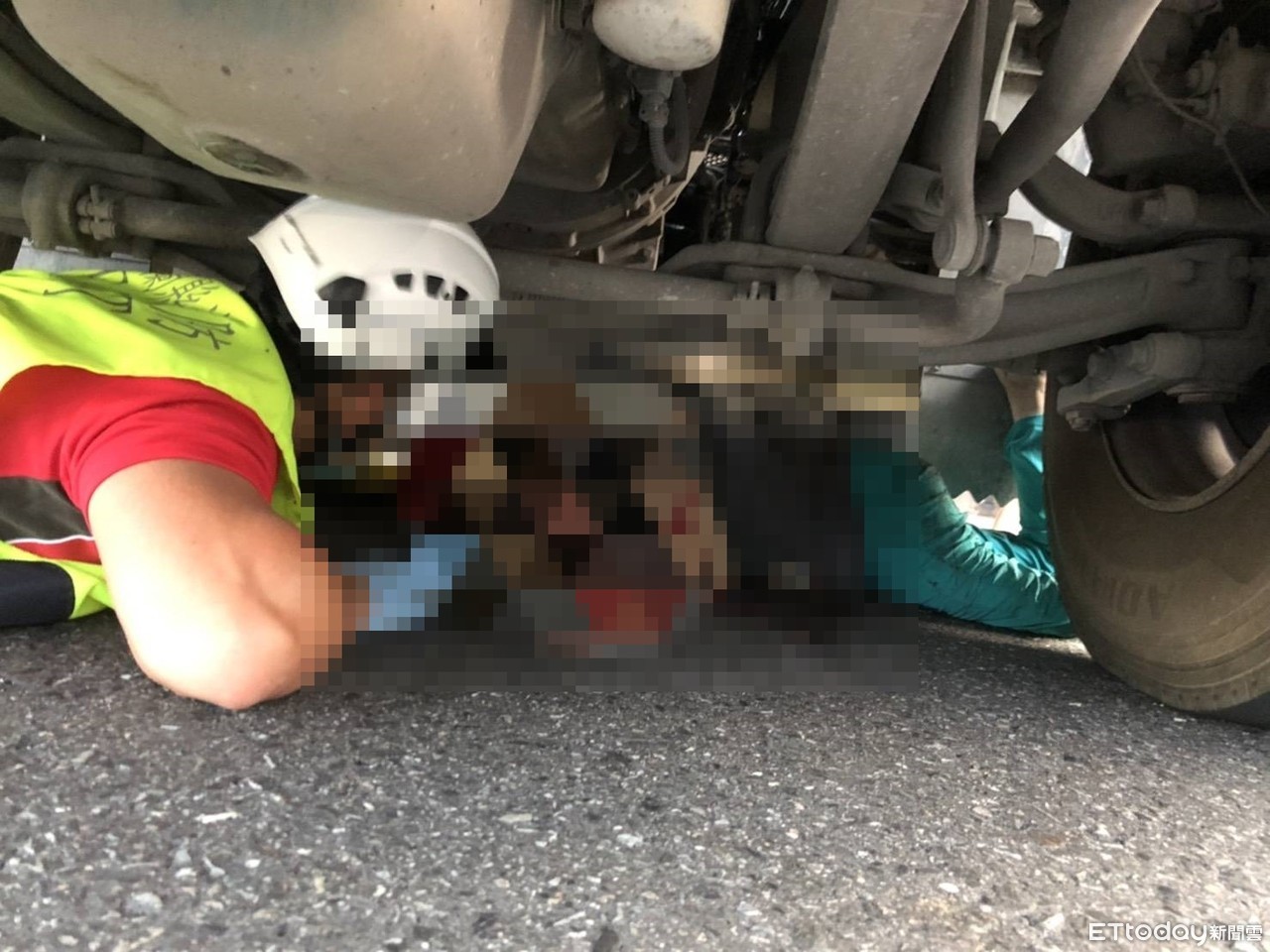 ▲傷者車禍後卡在車底,脫困後緊急送陽大附醫急救。(圖/翻攝畫面)