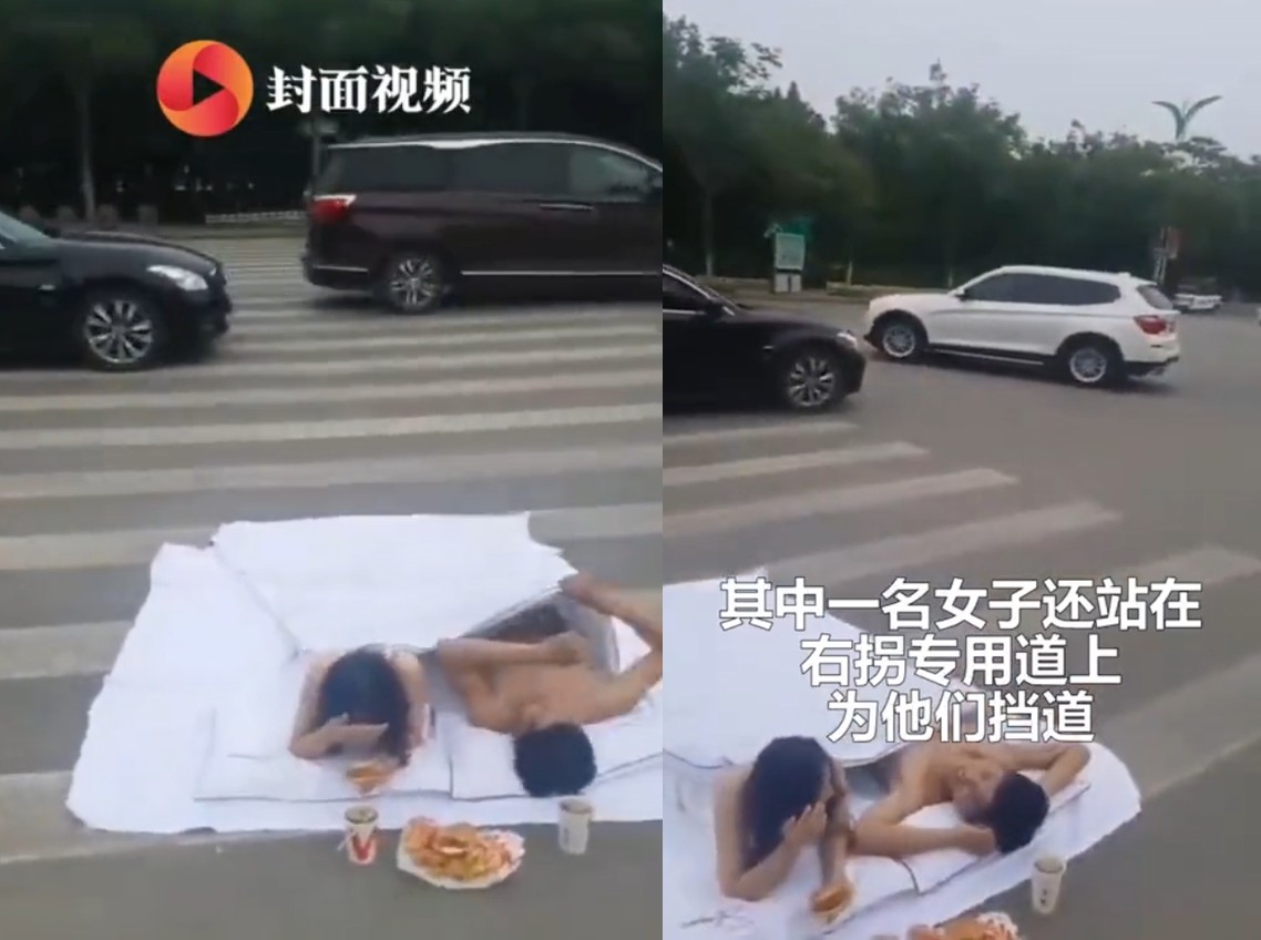 根據人民網報導,一對男女躺班馬線拍婚紗的影片11日在網路上瘋傳。山東鄆城縣某婚紗攝影會所的工作人員指揮,一男一女橫躺在班馬線上,男子裸上半身,身上蓋著純白色的床單和被子。
