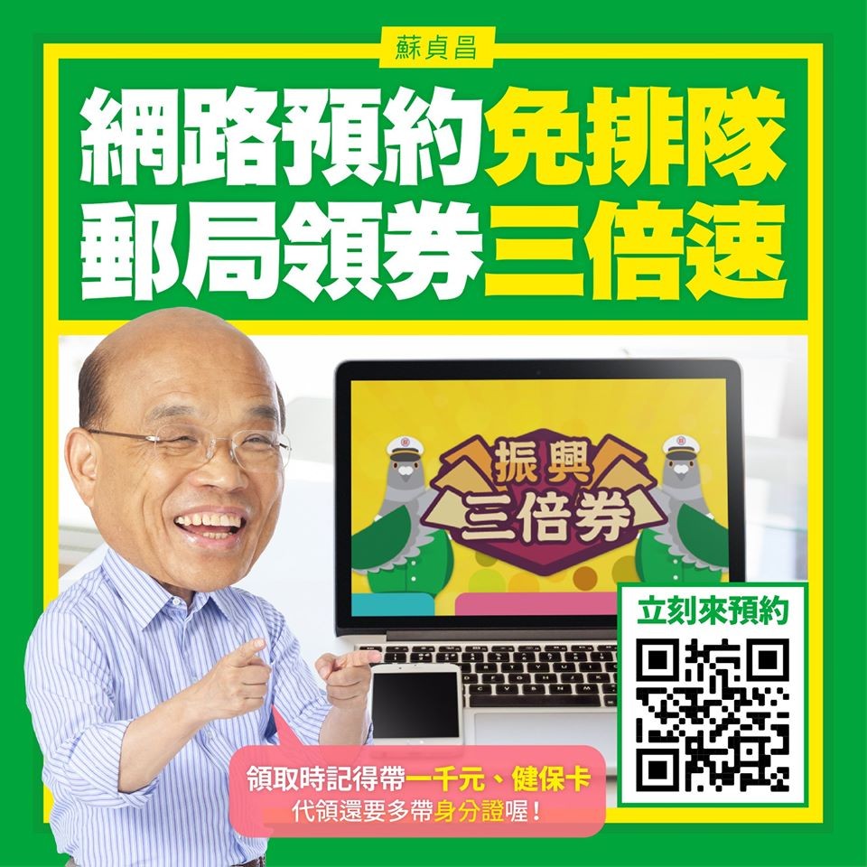 蘇貞昌說,「選好你方便的郵局、日期、時間,郵局人員發揮渾身本領,就是捨不得你要在現場排隊領!本人領請帶現金跟健保卡、代領要加帶身分證,現在就去預約!」