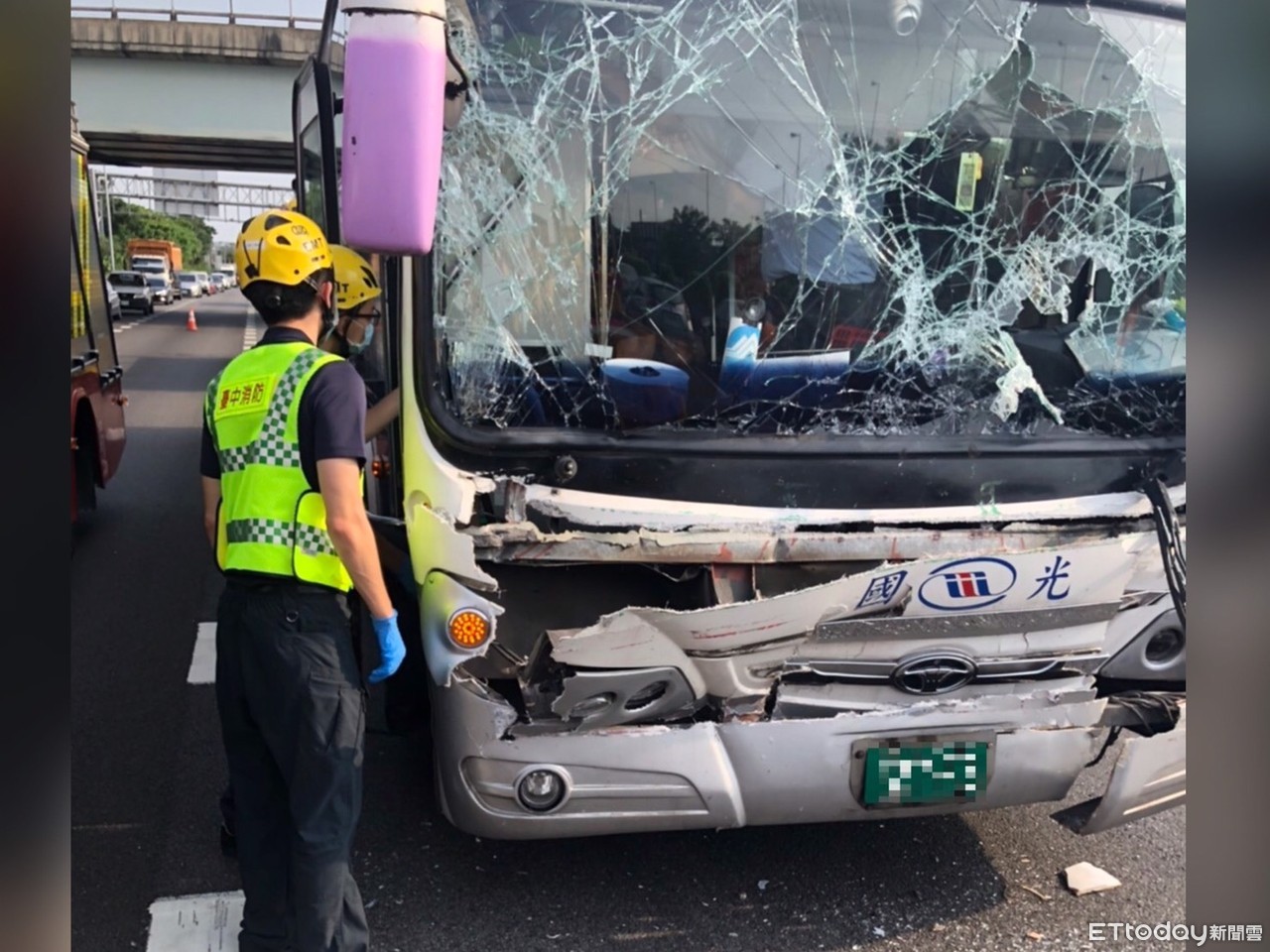 ▲▼國一北上國光客運追撞拖板車,釀13乘客受傷。(圖/記者李忠憲翻攝,下同)