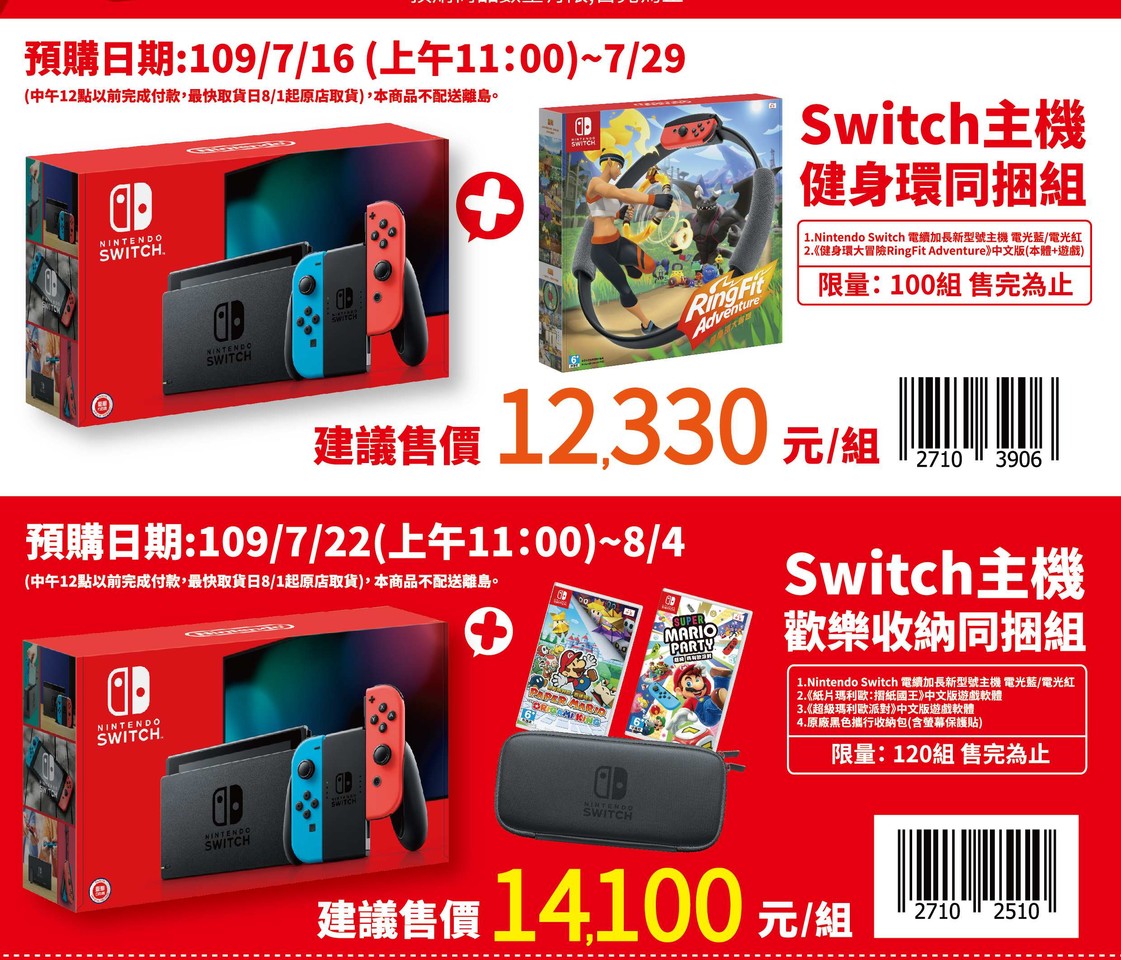 除了健身環同捆包系列,SWITCH主機歡樂收納同捆組預購,售價14100元,將從7月22日早上上午11點開放預購,限量120組售完為止。