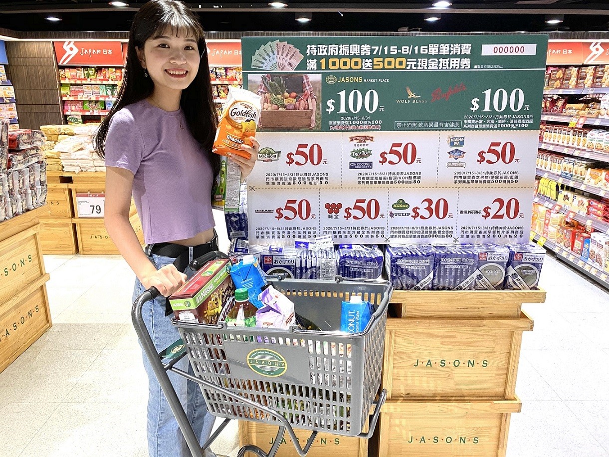 ▲全台量販超市加碼振興!其中「JASONS」攜手16大品牌推振興券回饋,消費滿1000送500現金抵用券。(圖/JASONS提供)
