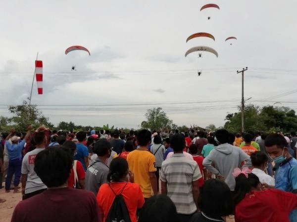 她將總計30萬泰銖的現金,換成20元、30元不等的鈔票與金項鍊,全部裝進袋子,找來10名專業人員駕駛飛行傘從天空灑下,除家鄉原先邀請的親朋好友外,也吸引其他鄉里的居民到場參加,總計約有超過3000人到場,當鈔票與金項鍊從天空拋下的那一刻,引起現場所有人的高聲歡呼。