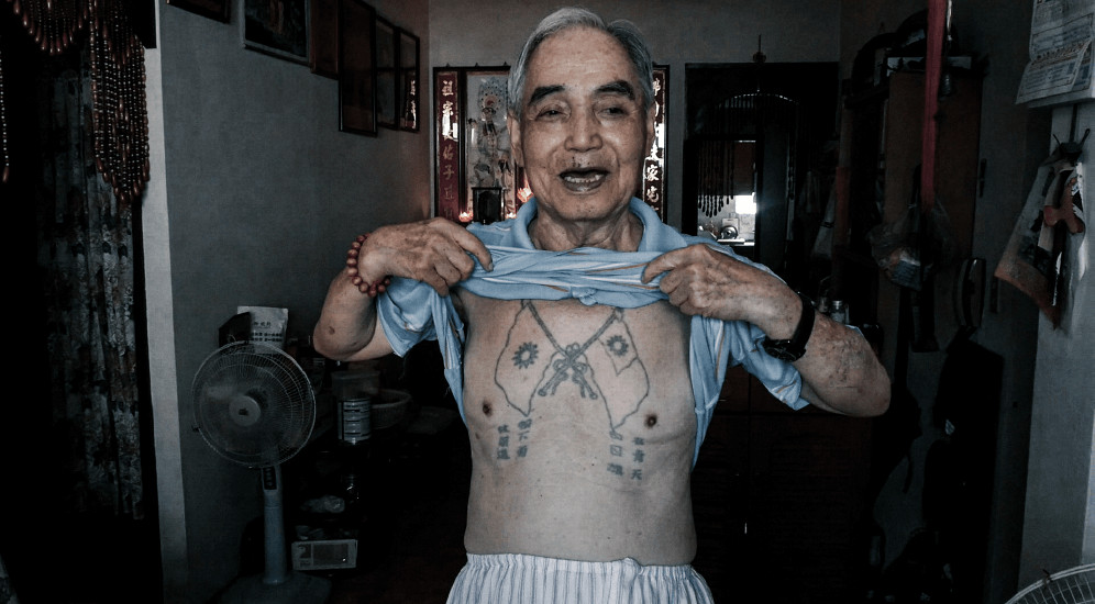 我們找到家住士林、高齡86歲的趙英魁,在年邁的軀體上尋得這段歷史存在的痕跡。當趙爺爺緩緩拉起上衣,胸膛上出現中華民國國旗與國民黨黨旗,下方則寫著「在青天白日旗幟下勇往前進」,他是不反共的反共義士。